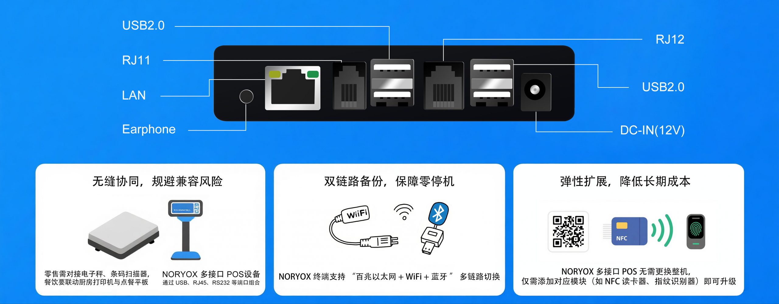 当前数字支付占比超 57%(Statista 2024),单一接口 POS 已无法满足多元经营需求,NORYOX 多接口设计的核心价值,精准直击 B 端客户实际诉求: